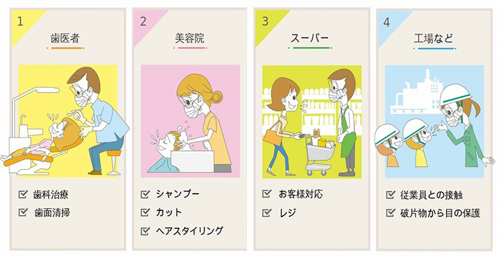 感染防止対策はしたいけど、本格的なフェイスガードまではちょっとできないし、動きにくいなあという声に対応したお手軽な感染防止対策グッズです。